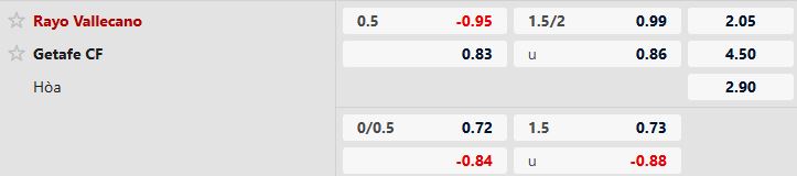 2.17 là thang điểm lợi nhuận cửa Vallecano thắng, cao hơn rất nhiều so với 4.05 ở cửa hòa trong khi điểm lợi nhuận của Getafe là 2.87. Đây là con số thể hiện được kịch bản đội chủ nhà ca khúc khải hoàn là kịch bản dễ xảy ra nhất. Thực tế, nhiệm vụ có 3 điểm của Vallecano cũng rất khả thi khi họ thể hiện được sự vượt trội so với đối thủ.